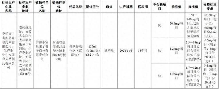 信网4月3日讯 3月27日,国家市场监管总局发布食品抽检不合格情况的通报,其中,迪巧星母婴旗舰店(经营者为河南省信阳市宝贝来了电子商务有限责任公司)在天猫销售的、标称安徽省阜阳市太和县众康药业有限公司委托安徽合天然制药有限公司生产的钙铁锌液体饮(蓝莓味),钙、铁、锌含量既不符合食品安全国家标准规定,也不符合产品标签标示要求。